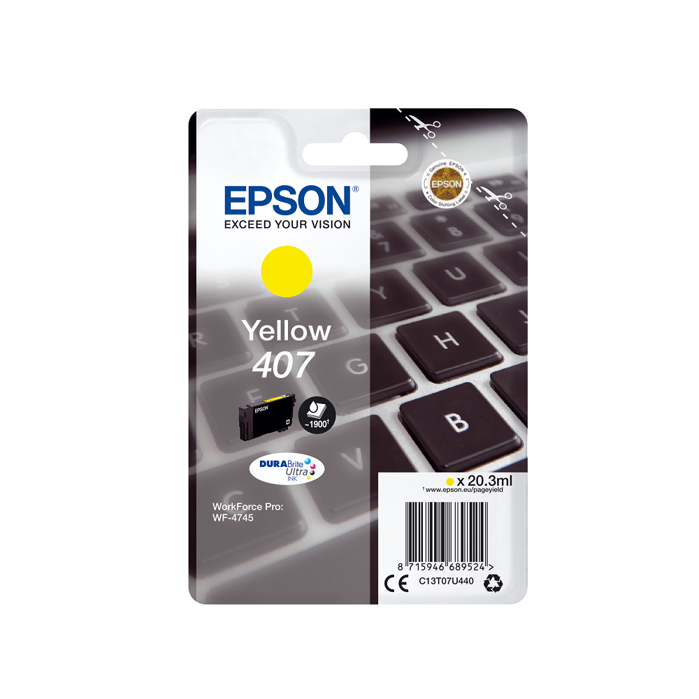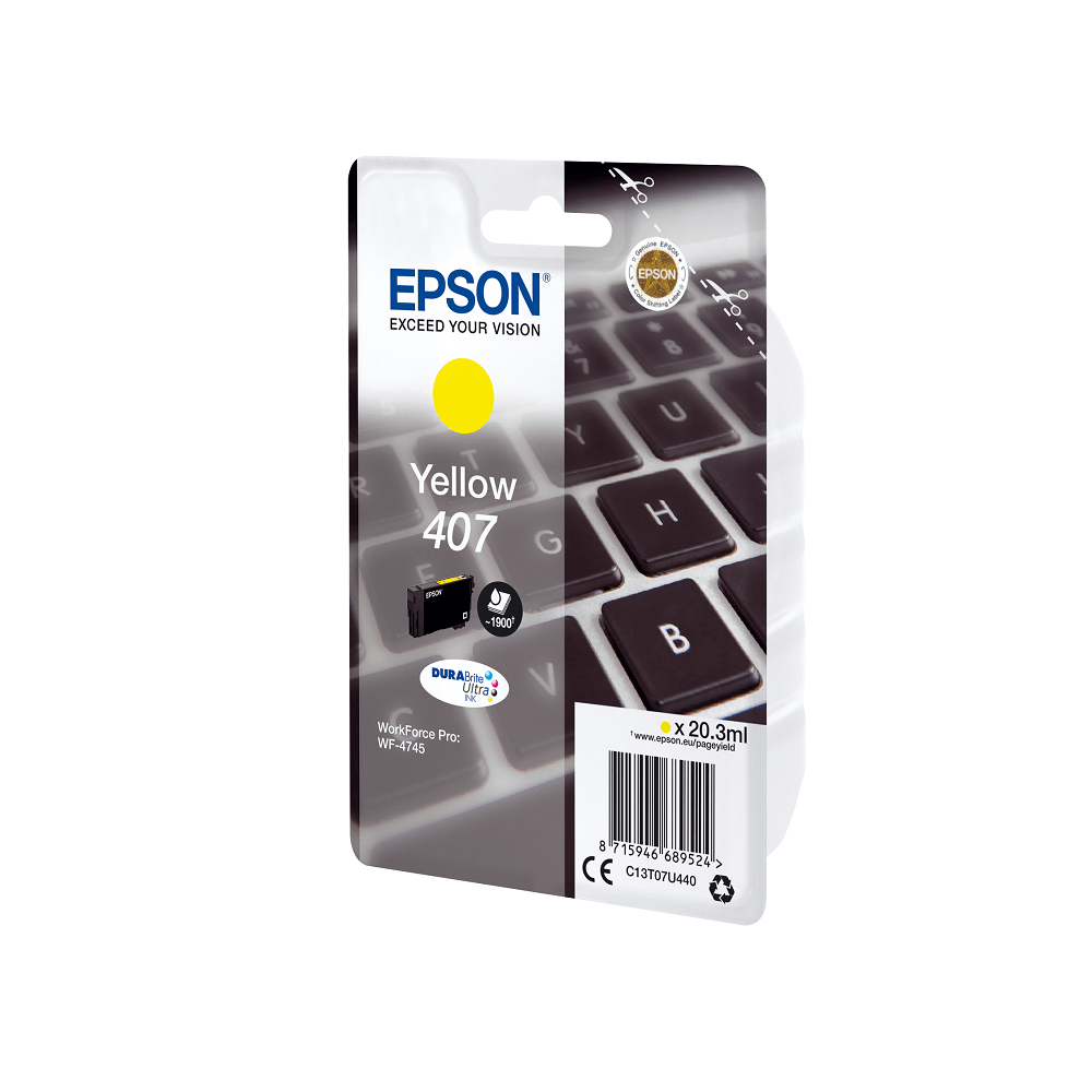 Cartucho EPSON 407 Amarillo (teclado). Los cartuchos 407 de Epson aportan eficiencia constante; como los prueba y aprueba Epson, se garantiza su fiabilidad y una calidad óptima.